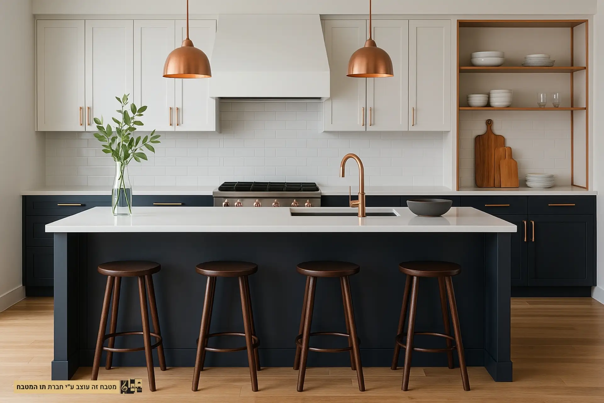 מטבח כחול כהה ולבן עם נגיעות רוז גולד