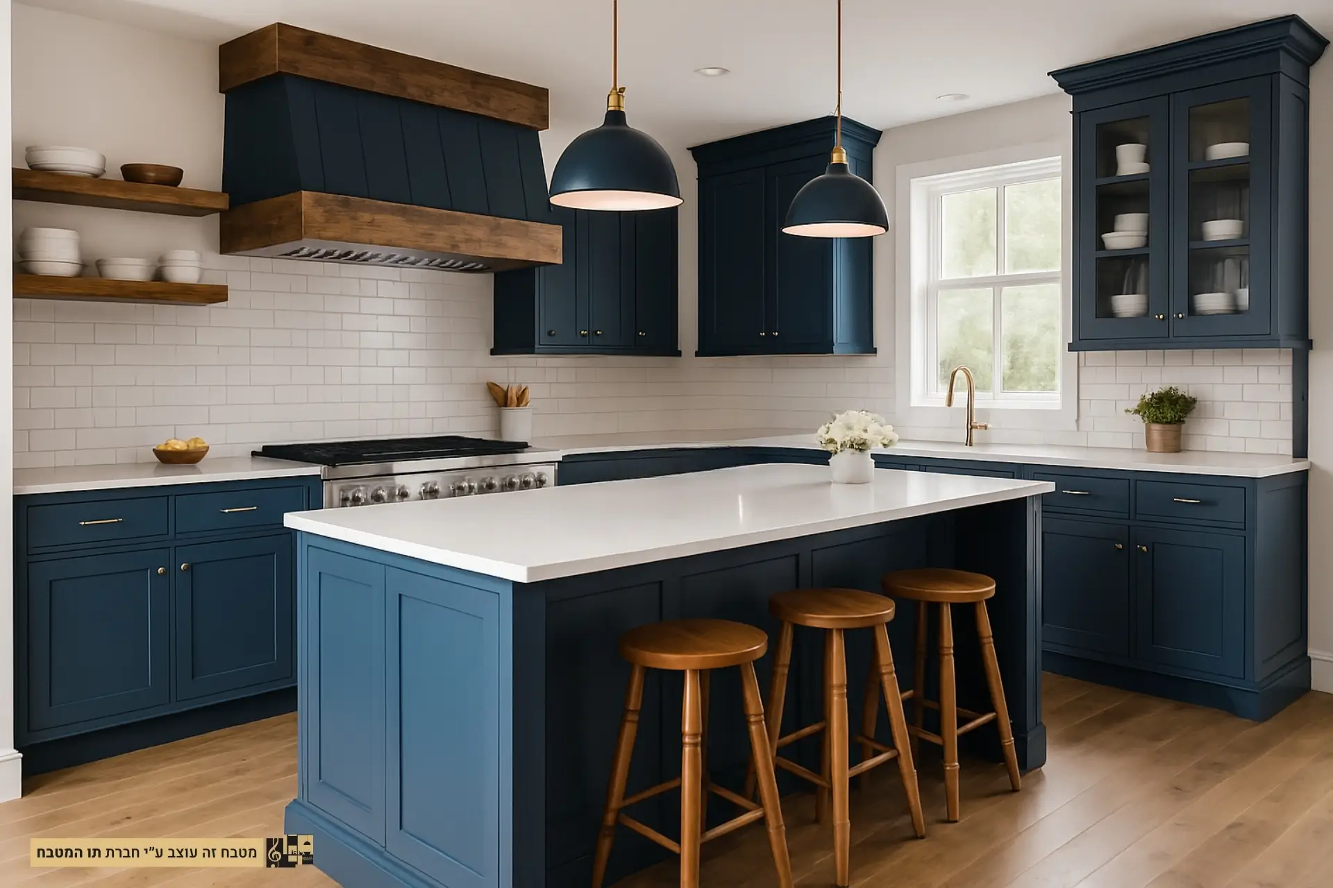 מטבח כפרי בצבע כחול כהה עם נגיעות עץ טבעי