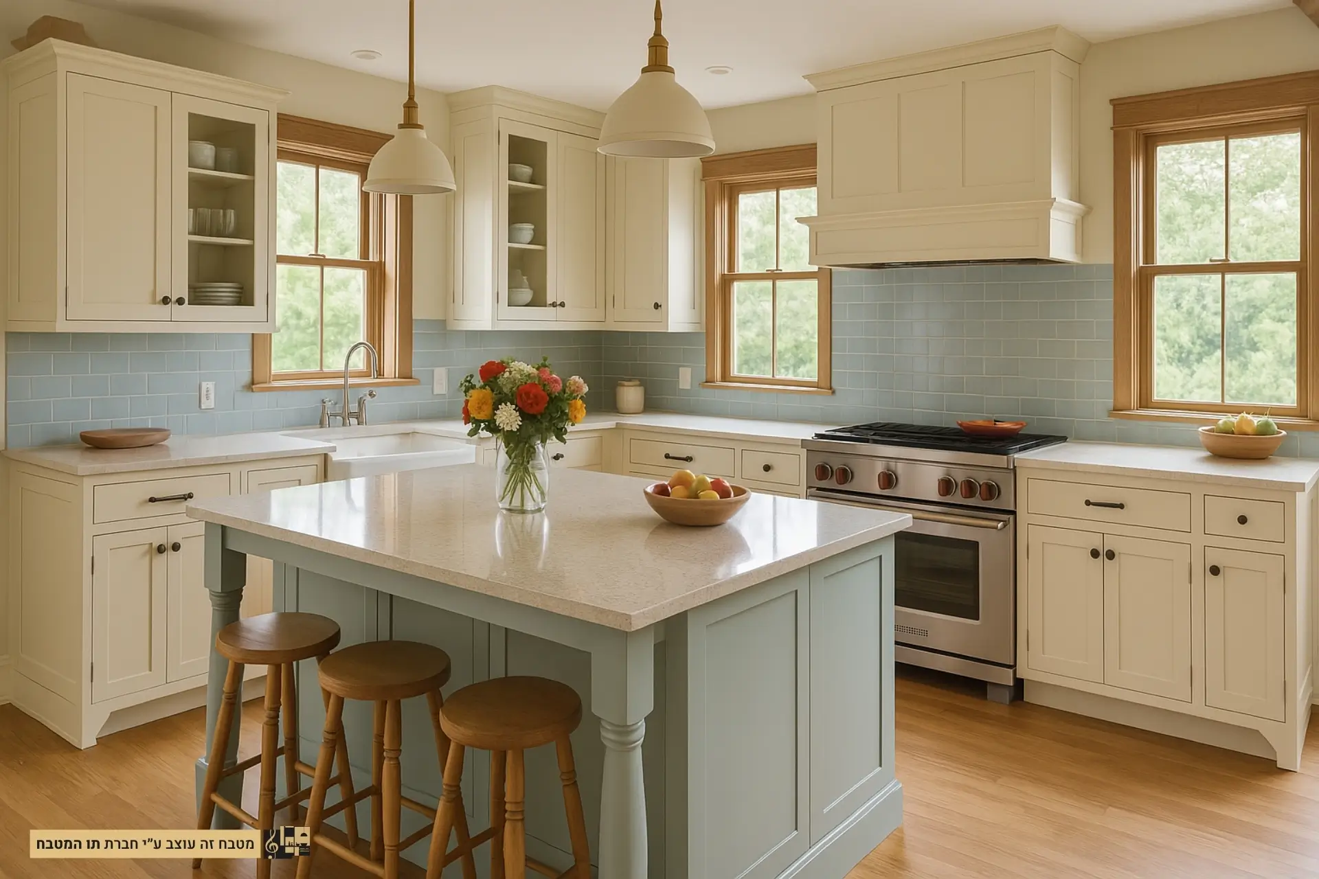 מטבח כפרי בהיר עם אי מרכזי בצבע תכלת רך