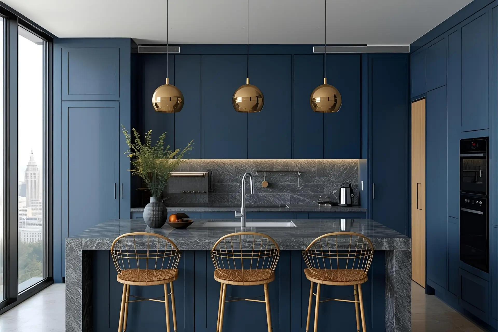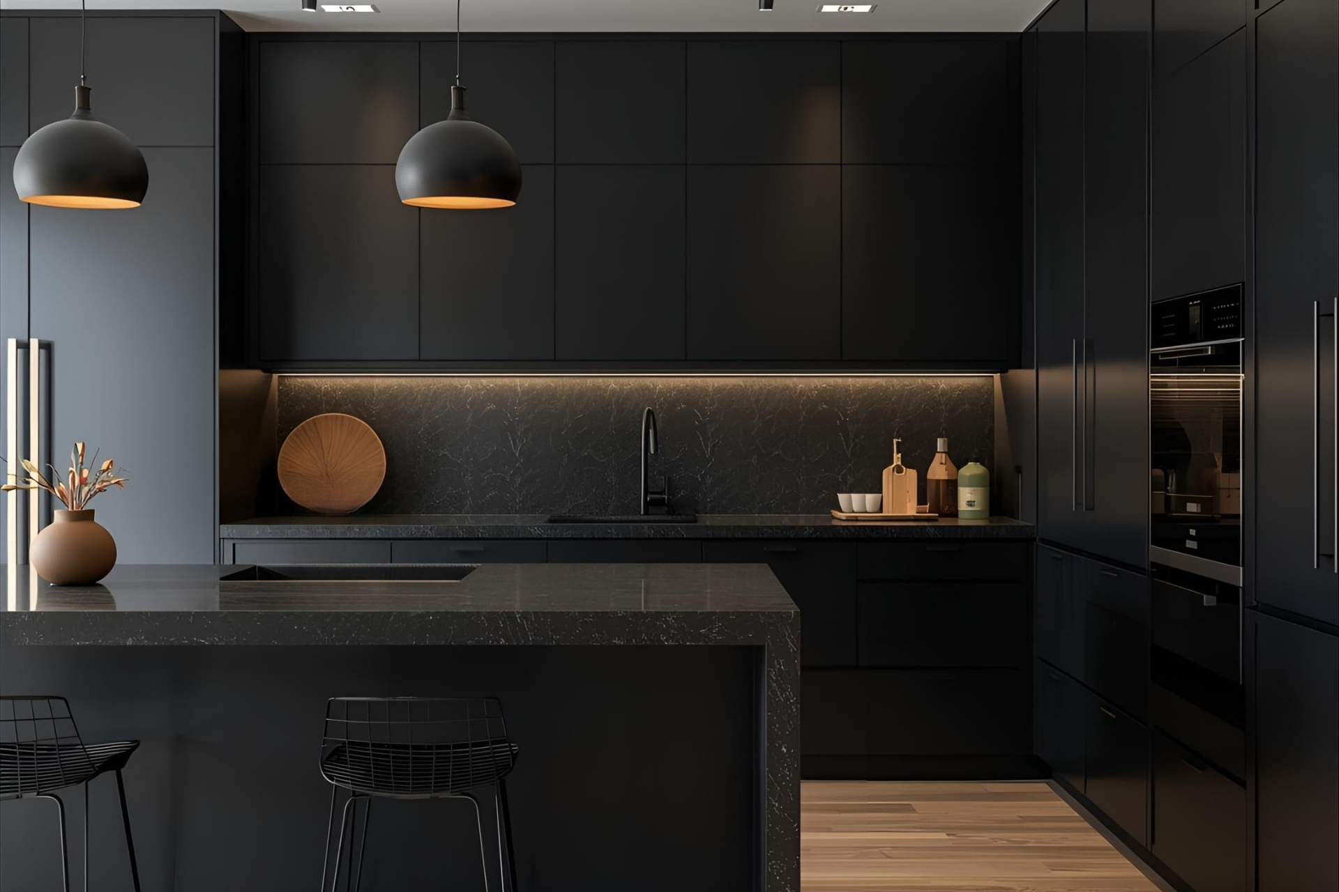 האי המרכזי רחב במיוחד, ומספק שטח עבודה נדיב וגם מקום ישיבה עם שני כיסאות בר שחורים בעיצוב מינימליסטי.
