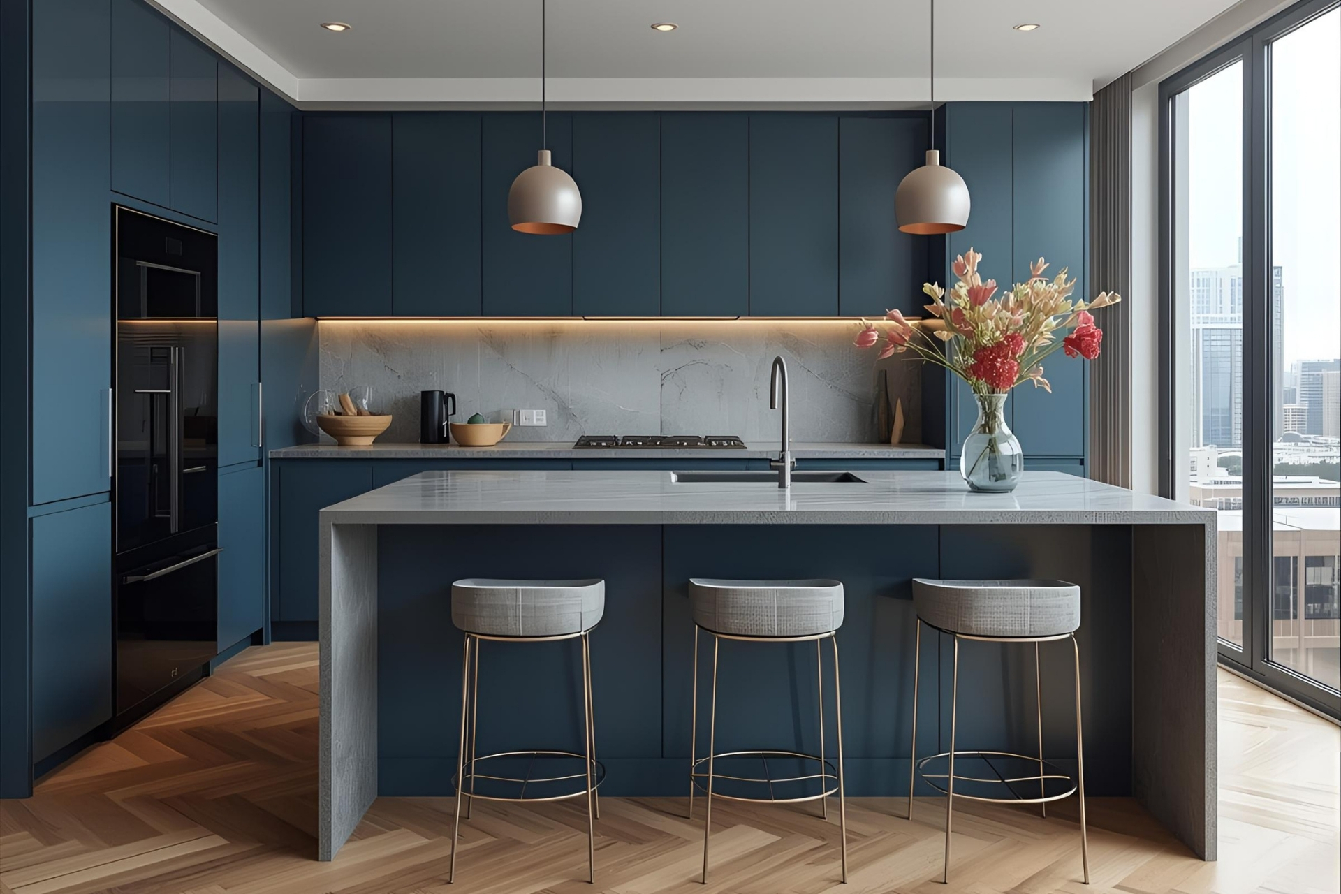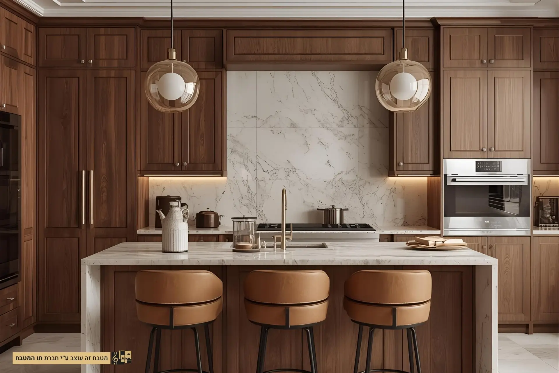 ידיות נירוסטה דקות משלימות את המראה הנקי והמאוזן, יחד עם גוף תאורה תלוי בקו מודרני ומתוחכם.