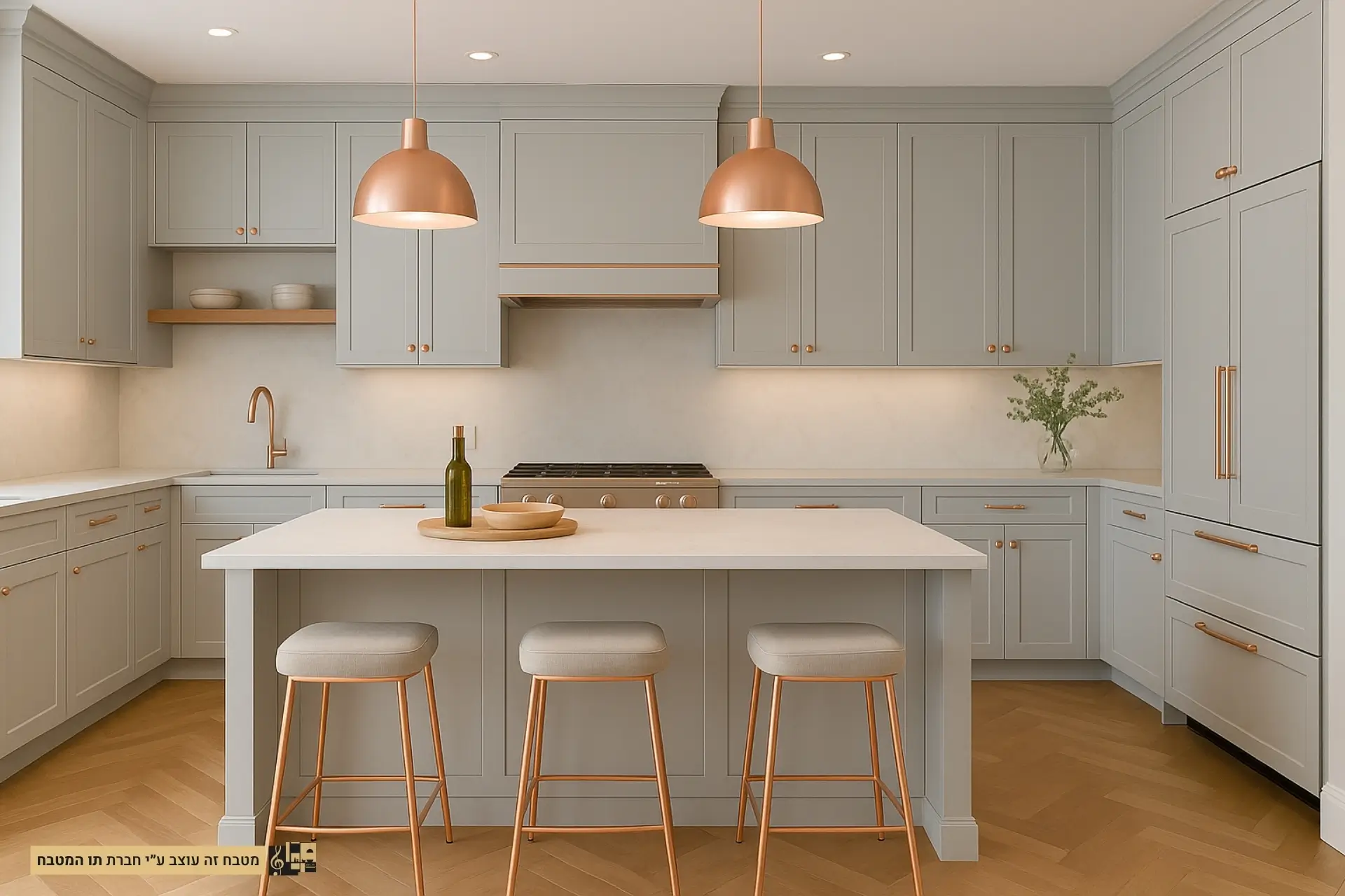 מטבח מרווח בעיצוב מודרני עם קווים מינימליסטיים, בשילוב צבעים מונוכרומטיים שמביאים איזון ואלגנטיות לחלל.