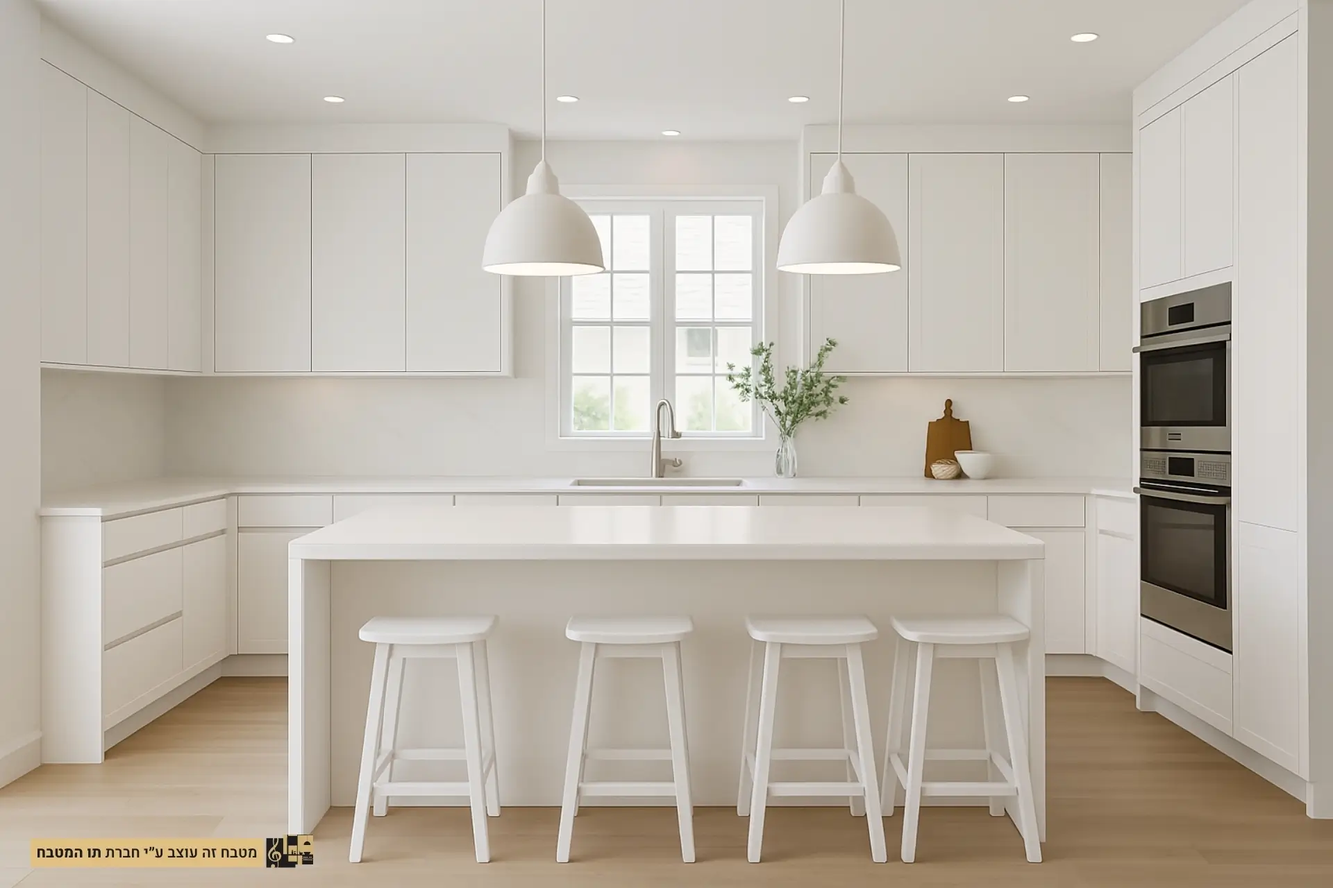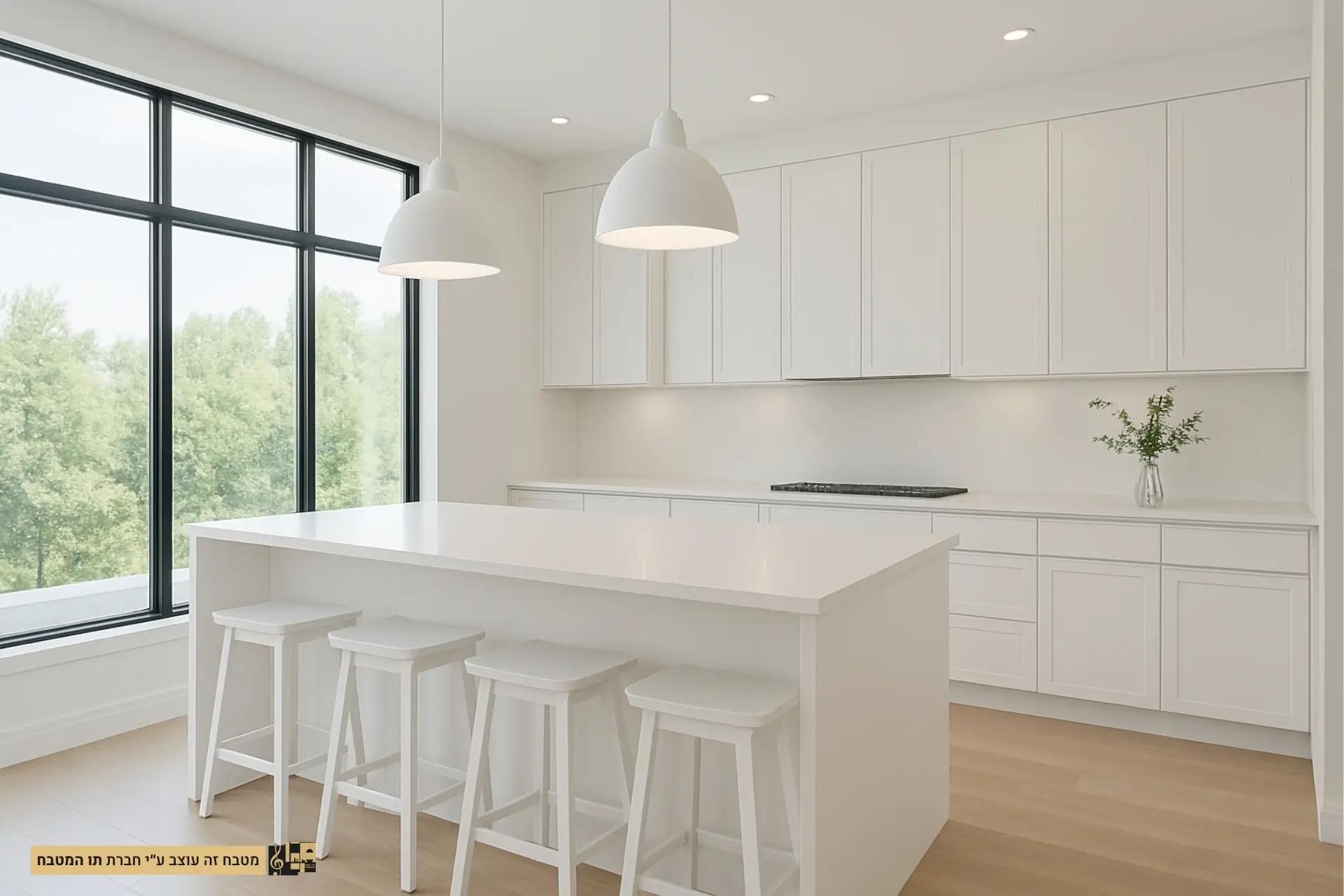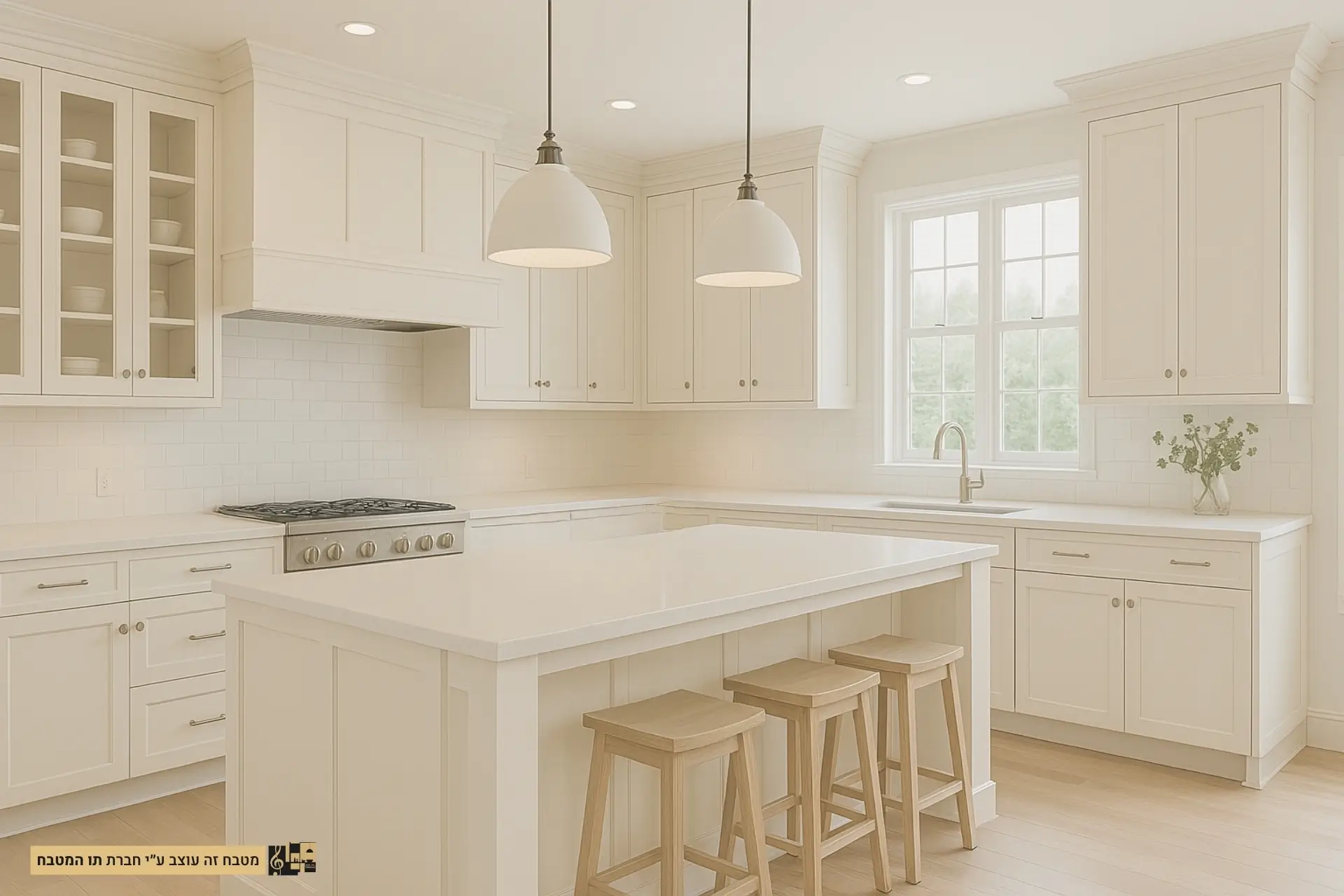 - חומרים וגימורים: שימוש בארונות עץ צבועים בלבן עם גימור מט או מבריק, משטחי עבודה משיש או קוורץ לבן, ורצפת עץ בהירה או אריחים קרמיים לבנים.