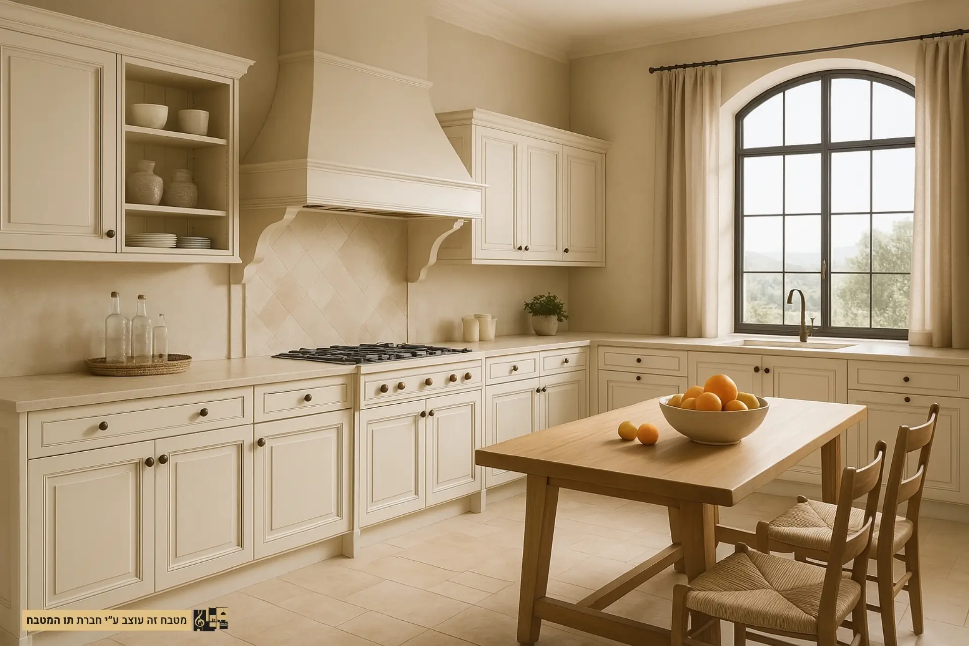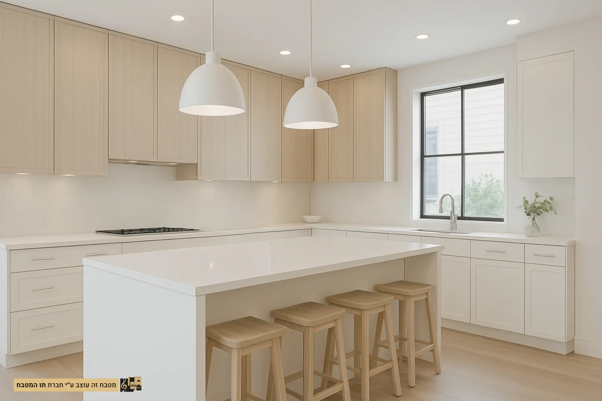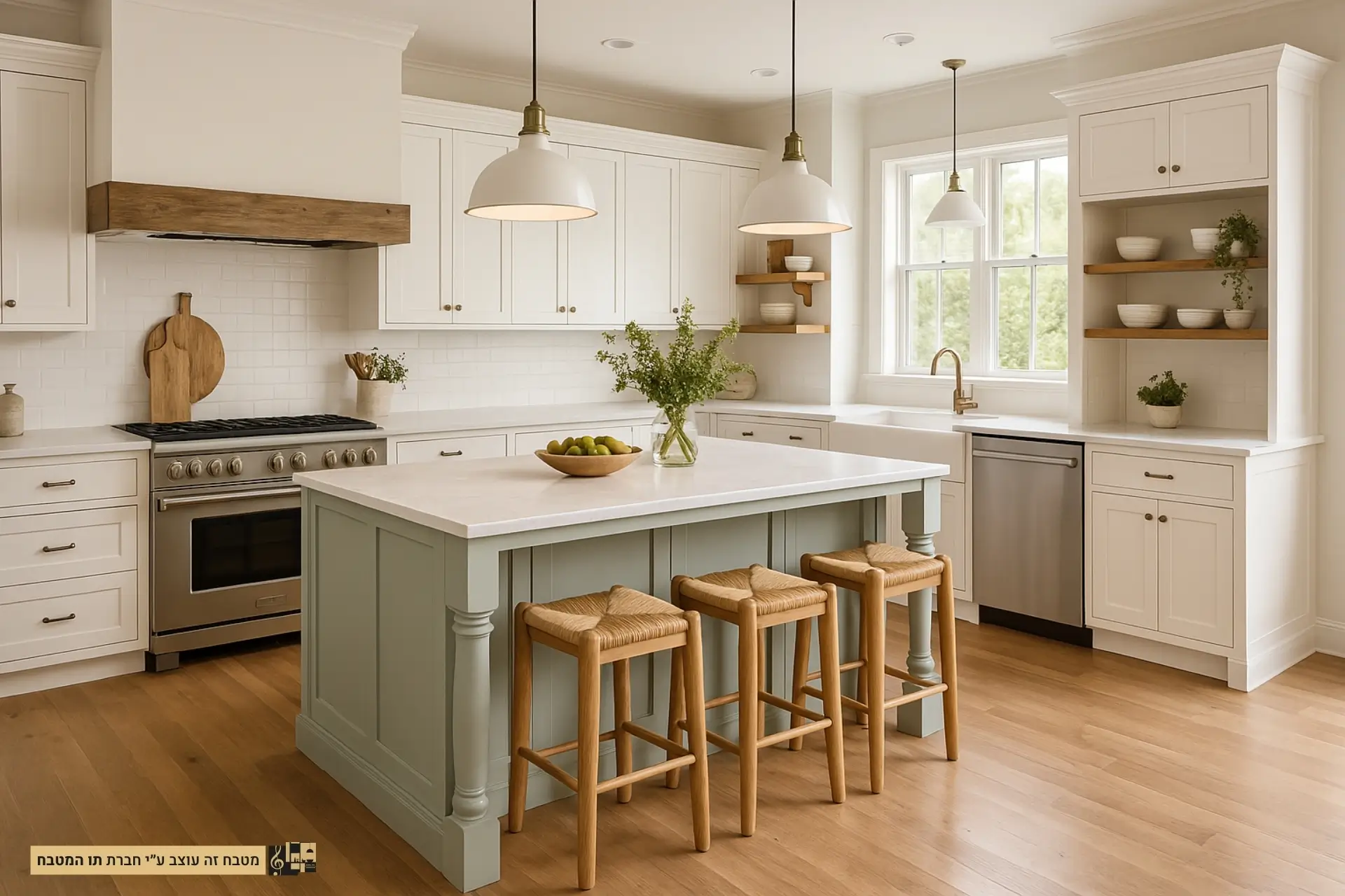 - חומרים וגימורים: שימוש בארונות עץ צבועים בלבן עם גימור מט או מבריק, משטחי עבודה משיש או קוורץ לבן, ורצפת עץ בהירה או אריחים קרמיים לבנים.